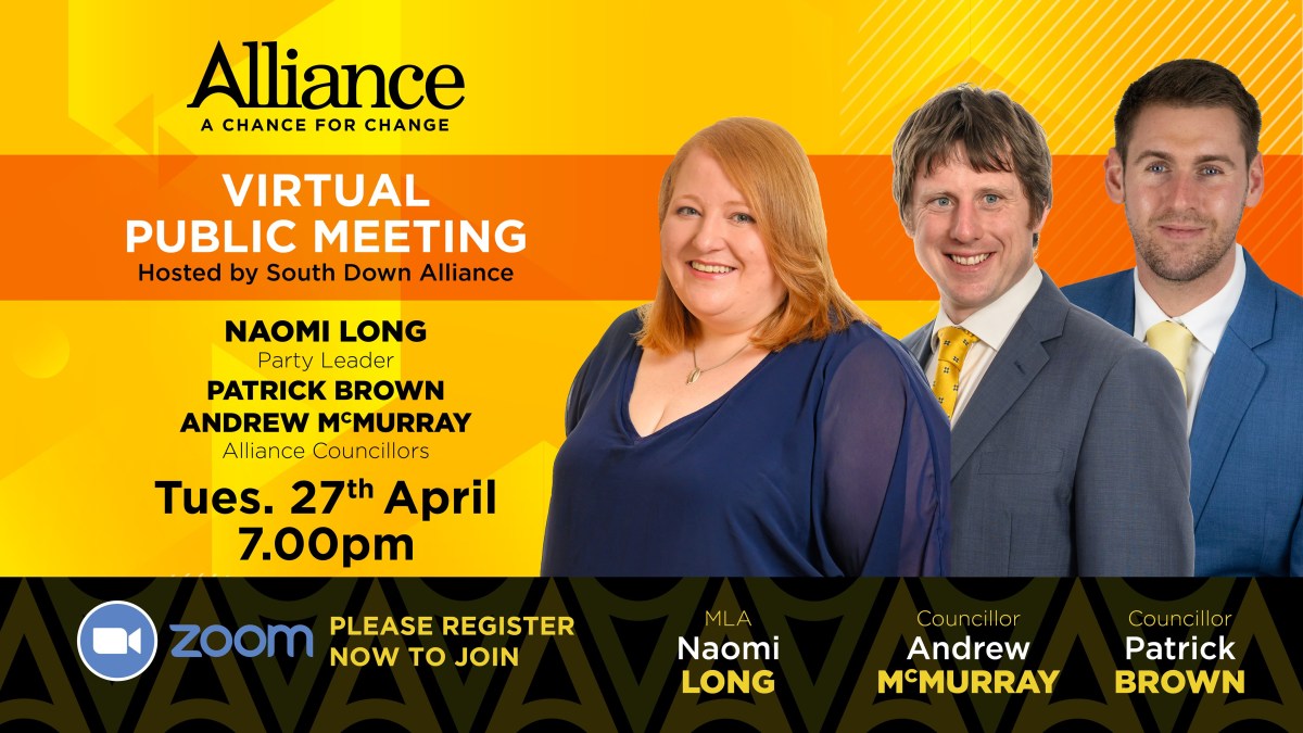 Local Alliance councillor, Patrick Brown, is pleased to announce a virtual public meeting, hosted by South Down Alliance, with Party Leader and Justice Minister Naomi Long MLA on Tuesday 27th April at 7pm.