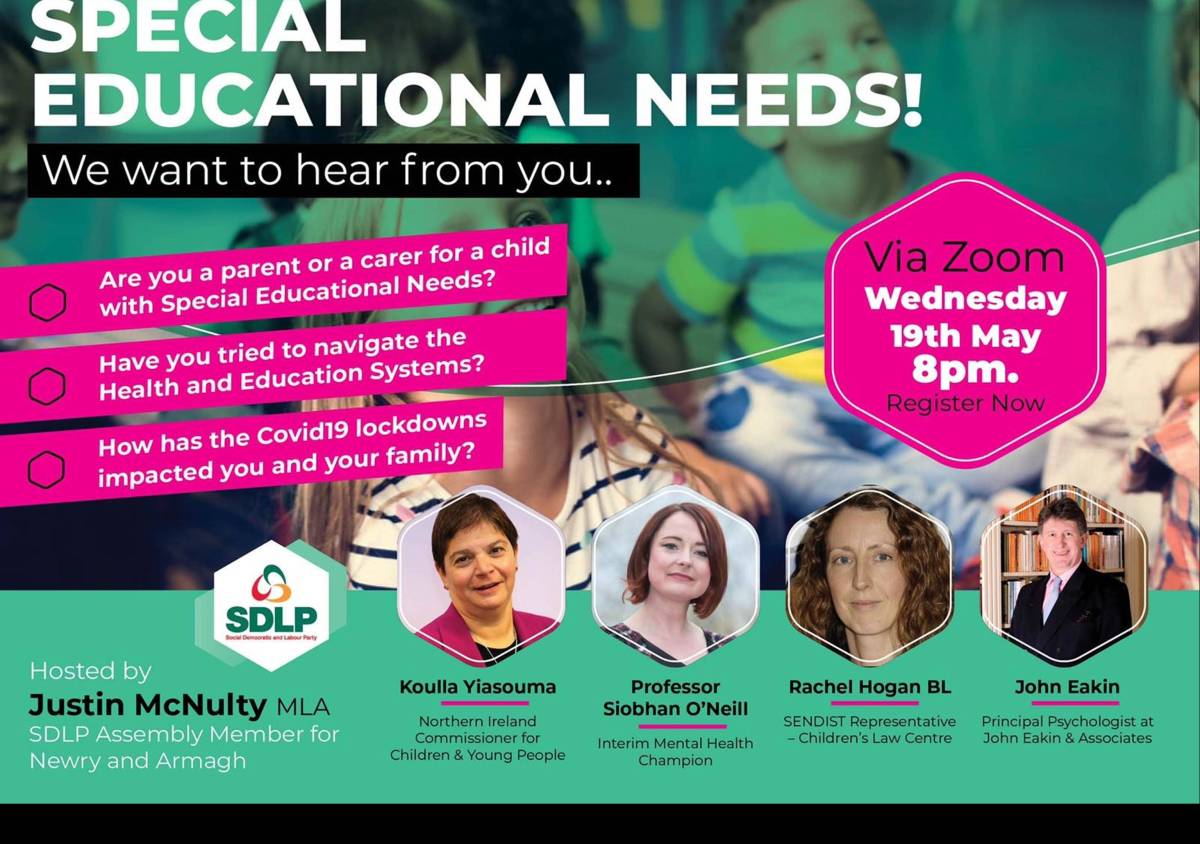 SDLP Assembly Member for Newry and Armagh Justin McNulty MLA has hosted an online Public Meeting on the issues facing parents and carers of children with Special Educational Needs.