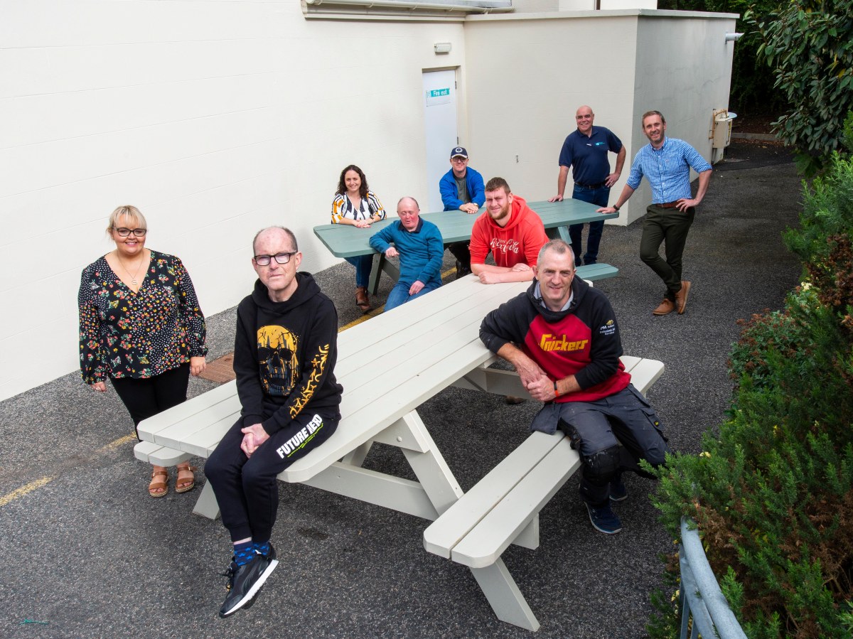 CAPTION: Service users, Southern Trust and ARC staff are pictured on the new benches for Drumcashel House including Sonya McCusker, Team Leader Adult and Learning Disability Team, Gavin Crilly Case Manager, Paul Mackin ARC Support Worker, Linda Daly Day Opportunities and Fintan Lonergan Transport Driver.