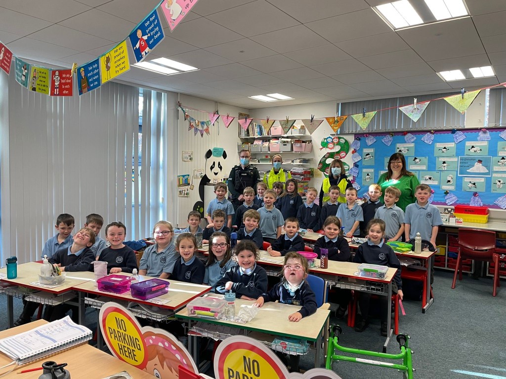 Gwen Bartley, PCSP Project Coordinator, was joined by the local PSNI – Road Education Officer and Neighbourhood Officers – as they spoke to Primary 3 pupils about how to stay safe when walking, cycling or travelling as passengers.