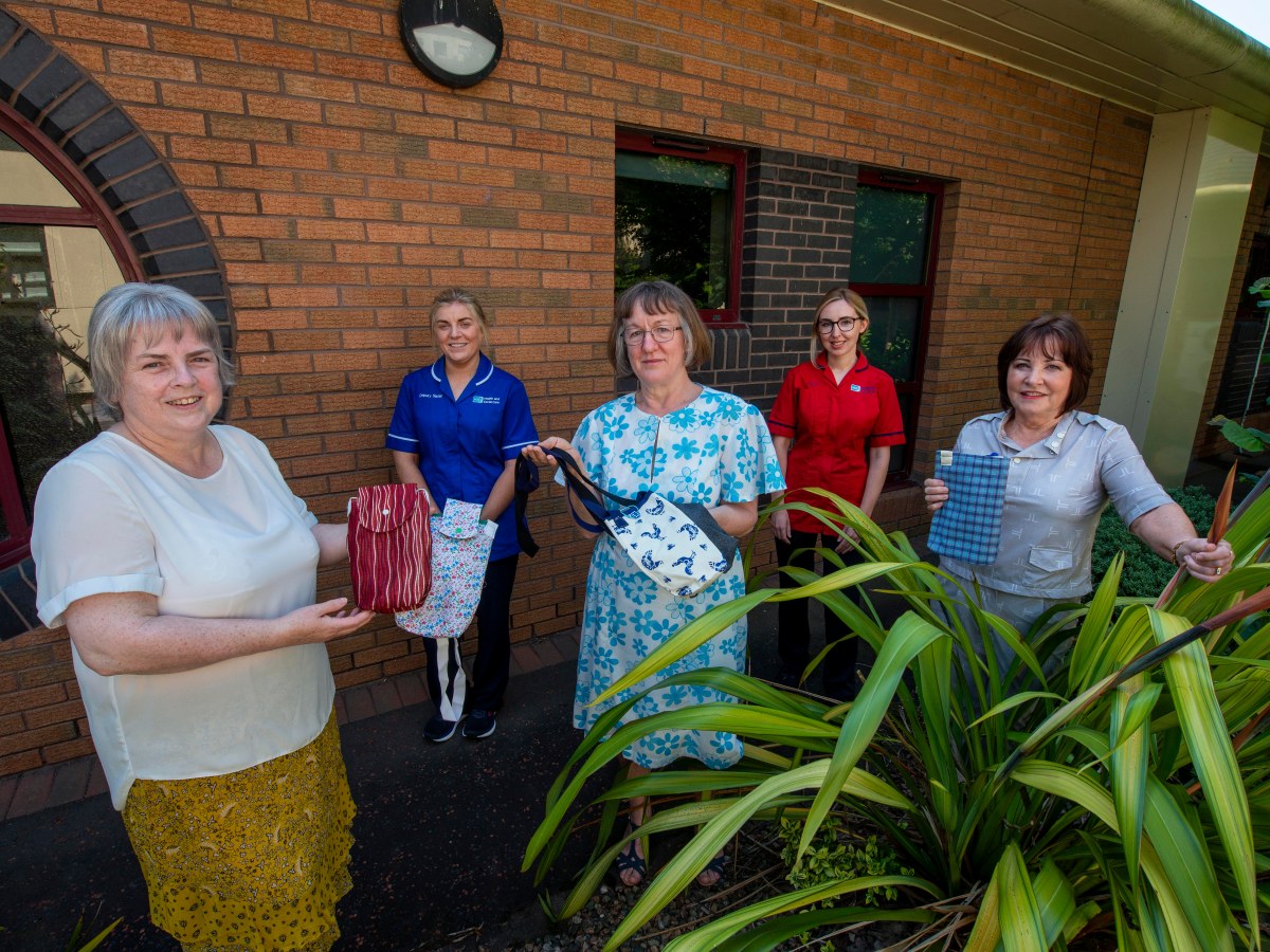 Lislea Sewing group members Mary O’Connor and Mary Murphy (who both retired from the Southern Health and Social Care Trust last year) and Geraldine Johnstone (who currently works as a Bank Health Care Assistant) are pictured donating the bags to Claire O’Connor (Clinical Sister) and Amy Ward (Unit Manager).
