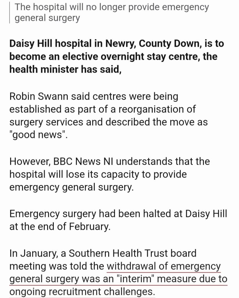 “Contrary to a report by the BBC today, no decision has been announced on the future of emergency general surgery at Daisy Hill Hospital. Nor has any decision been taken.