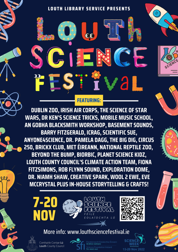For more information on Louth Science Festival contact your local branch library, email libraryhelpdesk@louthcoco.ie or Tel. 042 9353190 and follow Louth Library Service on Facebook and Instagram.