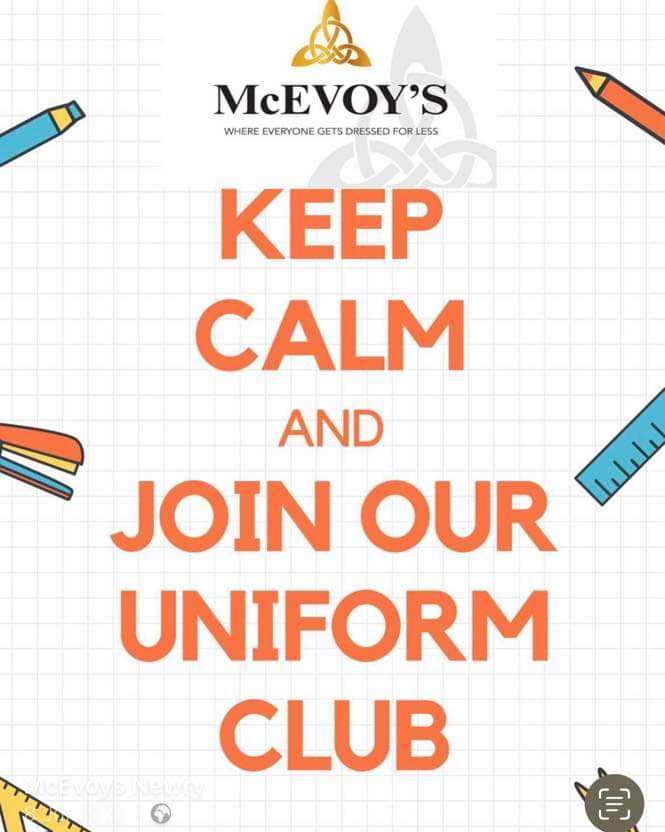McEvoys are offering a deposit scheme for school uniforms to take the pressure off sending your kids back to school , this will allow you to get in early and get your uniform put away with a deposit of your choice and pay it off at your convenience, collection of school uniforms on receipt of full payment !