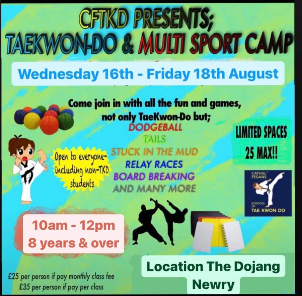 “We will be running our annual Tae kwon-Do / Multi Sport summer camp from Wednesday 16th August – Friday 18th August