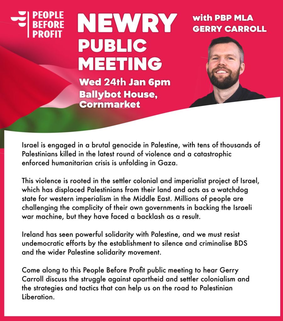 PBP Newry are hosting a Public Meeting on Palestine on Wednesday 24th at 6pm. Held in Ballybot House, Cornmarket. PBP MLA for Belfast West Gerry Carroll will be the main speaker, and there will be a Q/A session to conclude. The main topic for the meeting will be ‘How to win Palestinian Liberation’.