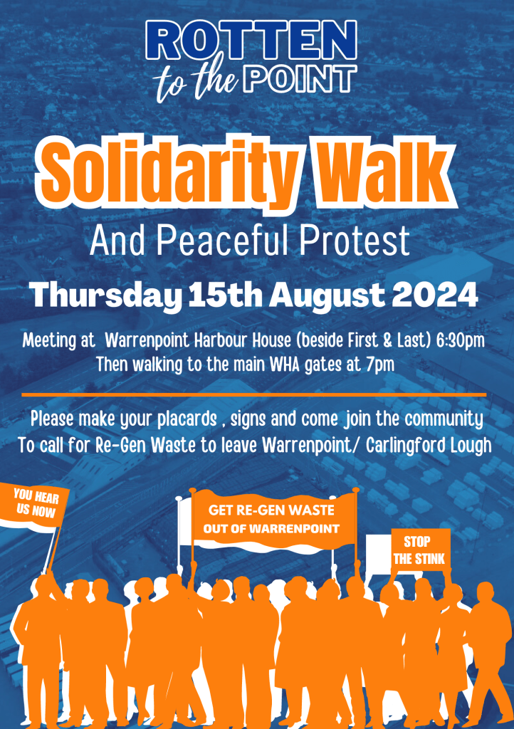 “That solution, to end the Re-Gen Waste open-air waste storage operation in Warrenpoint, has also been underwritten by the multiple signatures which we propose to present to the Minister if he is prepared to meet us during or before our Solidarity Walk and Peaceful Protest when people who feel that the democratic process has now been exhausted take to the streets in Warrenpoint on August 15th, meeting outside WHA Headquarters at 6:30pm for a walk to the entrance of Warrenpoint Port.”