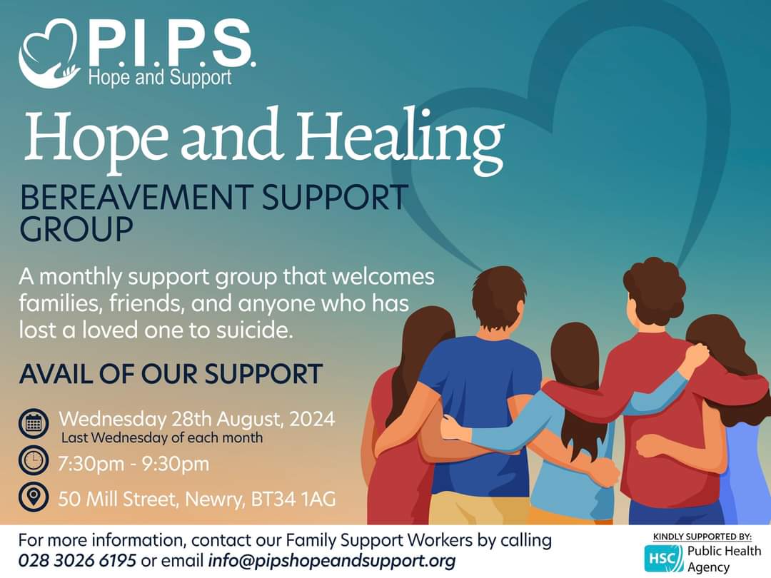 Join us for our next group on Wednesday, 28th August 2024, from 7:30 pm to 9:30 pm at 50 Mill Street, Newry, BT34 1AG. This monthly group meets on the last Wednesday of each month and provides comfort, understanding, and community support.