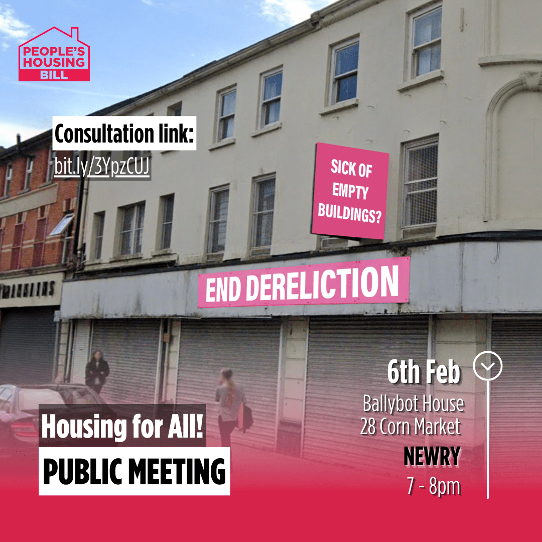 People Before Profit Newry has organised a public consultation meeting, on the topic of the escalating housing crisis and its devastating impact on working class communities. The meeting will take place in Ballybot House, on Thursday 6th February at 7pm.