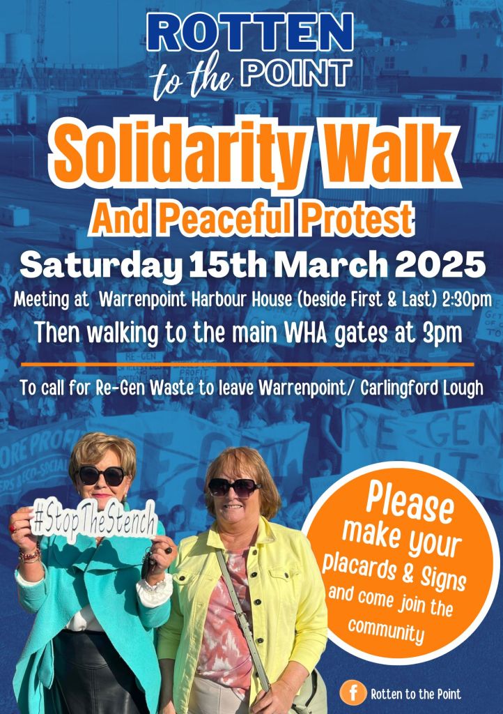 This peaceful event is in support of the community of Warrenpoint and Carlingford Lough and the fears they have of this stinking black bin waste and the effects it has on residents, businesses, tourism, property prices and the environment of the Carlingford Lough and everyone is welcome to come and join us.