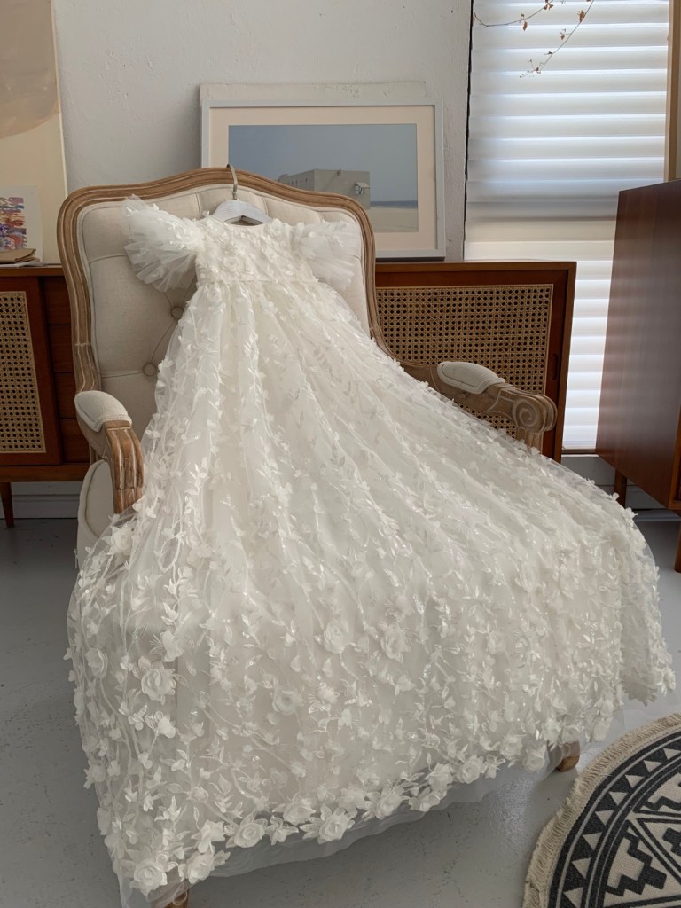 With soft, flowing textures, intricate lacework, and hand-finished touches, every gown and romper in this exclusive collection radiates grace, tradition, and meaning.